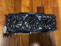 Видеокарта GigaByte-Windforce-GTX-780ОС-3GB-384bit-GDDR5. Данная в/карта позиционируется как графическое решение хорошего уровня. Видео-чипсет от NVIDIA, память Samsung, поддержка 4-х активных дисплеев. Видео-разъемы подключения: DisplayPort, DVI-D, DVI-I, HDMI. Отличная система охлаждения на три мощных вентилятора. Разъем дополнительного питания: 8+8 pin. Рекомендуемая мощность блока питания: 600Вт. Температура и тесты в FurMark: в простое 31-35С, на макс. 68-72С, fps/62-65. На фото видно. Если карту поставить в хорошо продуваемом корпусе, то температура будет еще ниже. По производительности мощнее GTX-1050TI. В идеальном рабочем состоянии.