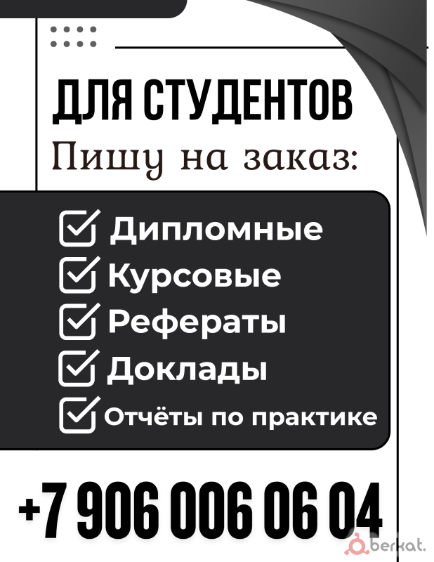услуги для студентов выполняю на заказ учебные работы: дипломные работы курсовые проекты рефераты доклады отчёты по практике индивидуальный подход, соблюдение сроков и требований. телефон: +7 906 006 06 04